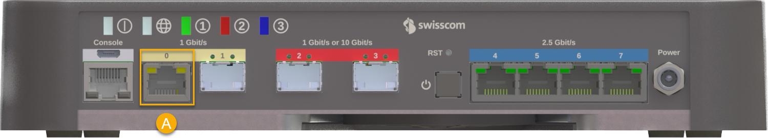 The router port GE0 (A) is used for ABR bandwidths up to 1 Gbit/s. Connect the port GE0 (RJ45 connector) with an Ethernet cable (not included) to a LAN port of the EC-XS or Business Internet router. The LED of the network interface of port GE0 must now flash green.